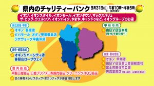 山日YBS本社チャリティーバンク 8月30日(土)午後6時30分~午後8時 8月31日(日)午前9時~午後8時 ※8月30日(土)午後8時~8月31日(日)午前9時の間は募金のお預かりは出来ません 県内各…