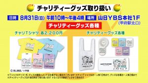 日時 8月31日(日)午前10時~午後6時 ※なくなり次第終了 場所 甲府駅北口 山日YBS本社1階 取り扱い チャリTシャツ、チャリティーグッズ各種 ※Tシャツのサイズ・色、グッズの種類に…