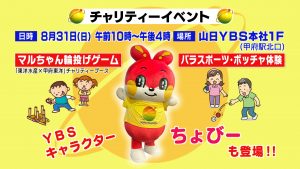 日時 8月31日(日)午前10時~午後4時 会場 甲府駅北口 山日YBS本社1Fロビー・屋外 イベント内容 ■マルちゃん輪投げゲーム 「東洋水産×甲府東洋」チャリティーブース ■パラスポ…