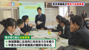 若手の県職員が出身の高校を訪れ、地域課題に取り組む力を養ってもらうための出前授業を行います。