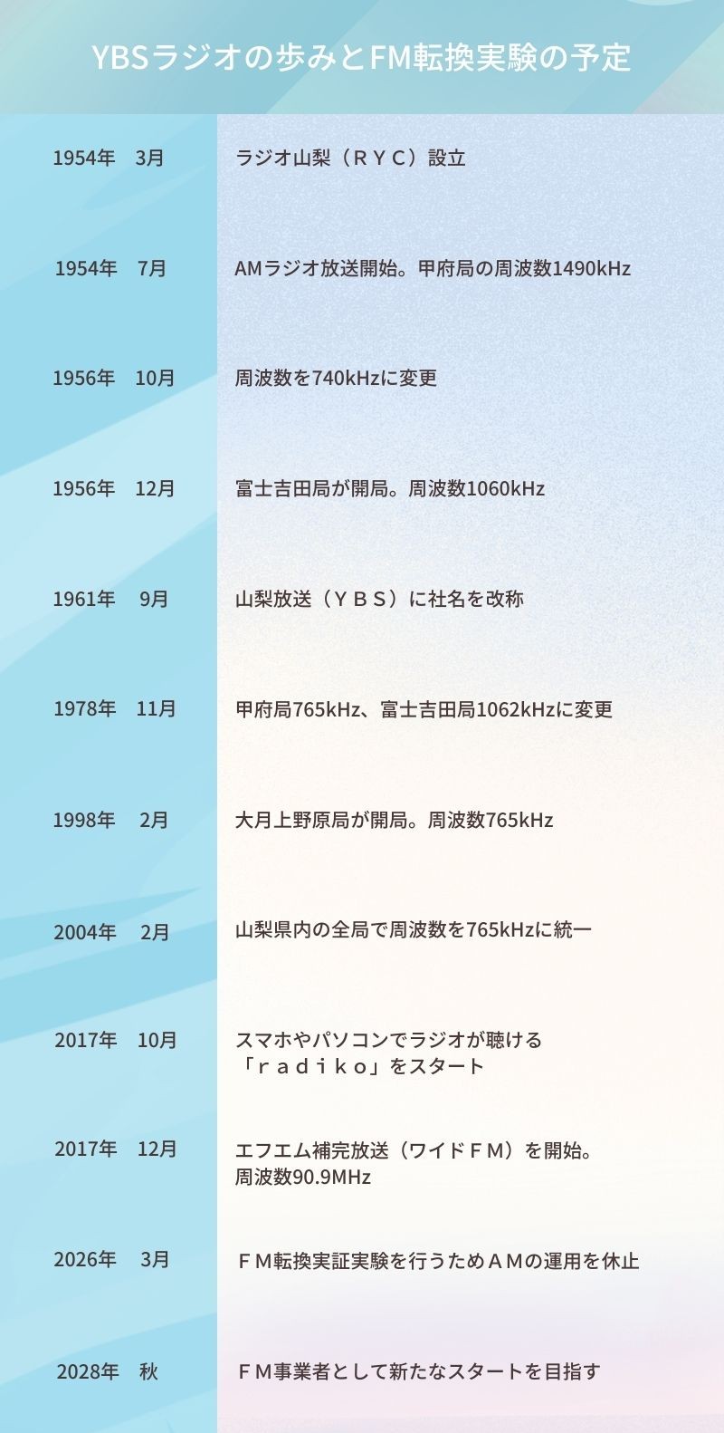 YBSラジオは、1954年の開局より電波を出し続けていたAM放送を休止して、2026年3月1日からFM放送のみとなります。